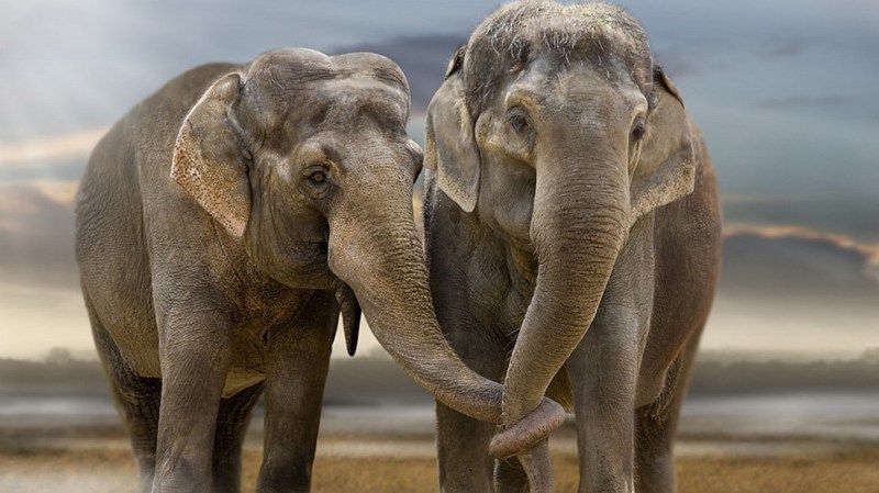 Elephants holding trunks